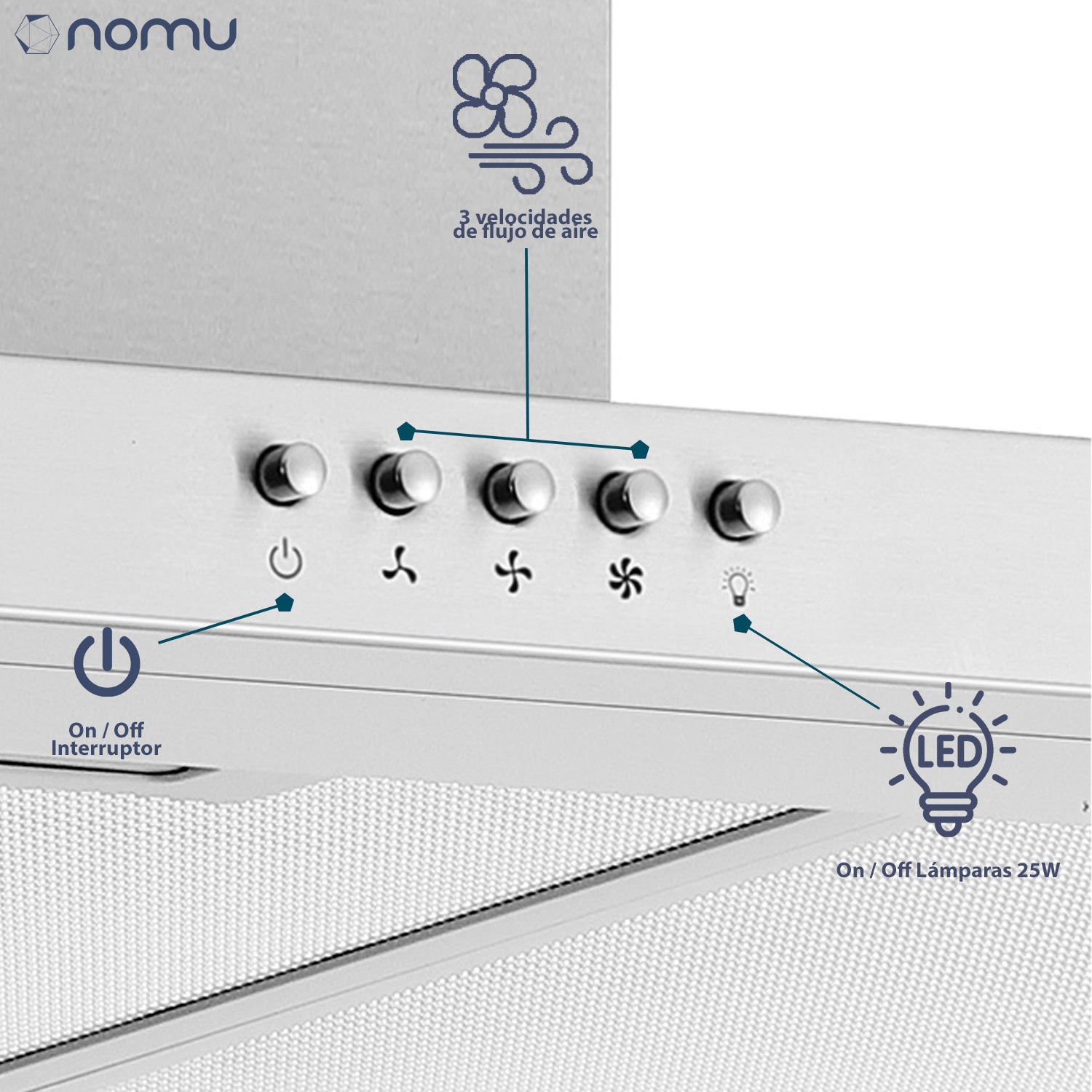 Campana extractora de pared NOMU de 60 cm, con diseño moderno en acero inoxidable y vidrio templado negro. Ideal para mantener tu cocina libre de grasa y olores, combinando estilo, eficiencia y funcionalidad.