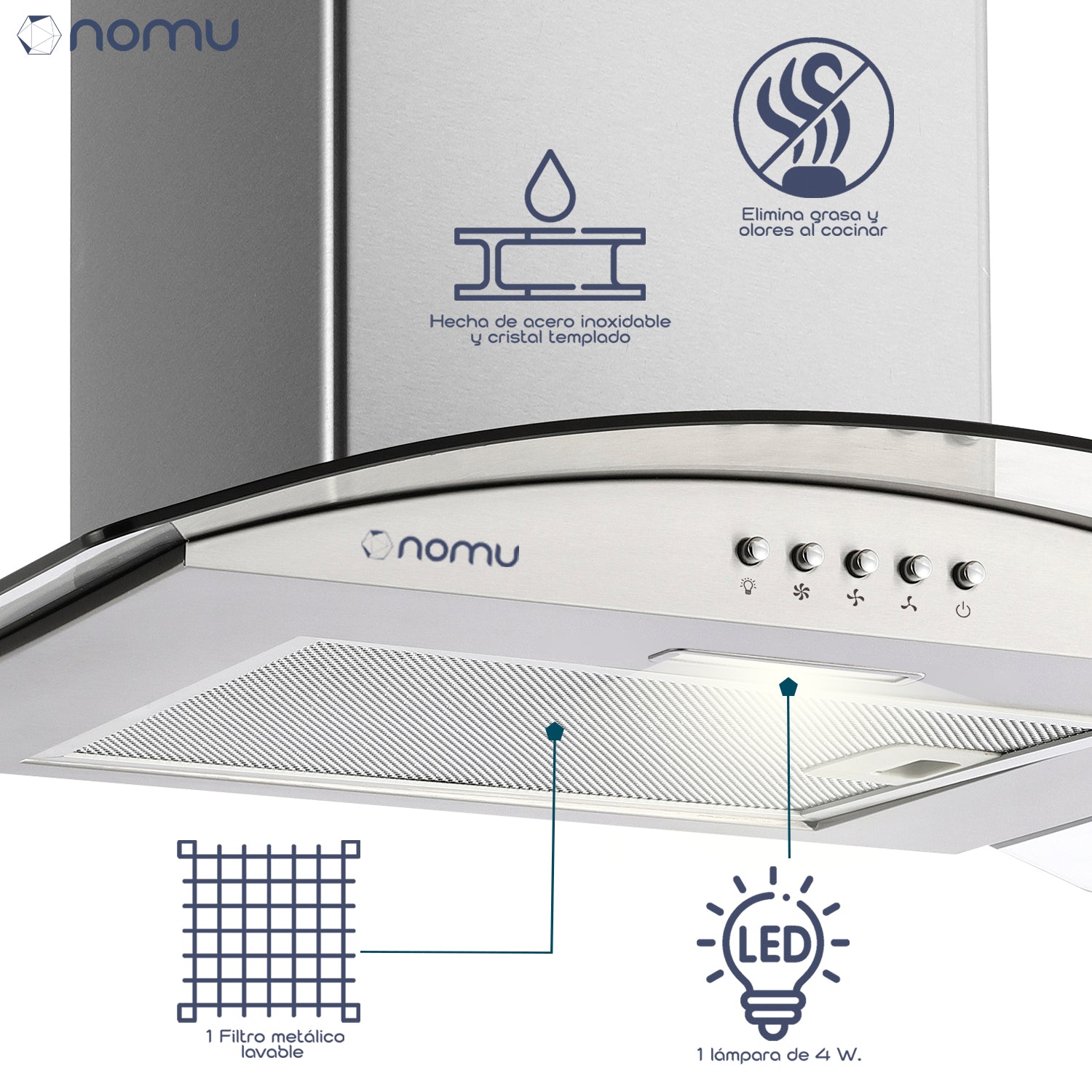 Campana extractora de pared NOMU de 60 cm, con diseño moderno en acero inoxidable y vidrio templado negro. Ideal para mantener tu cocina libre de grasa y olores, combinando estilo, eficiencia y funcionalidad.