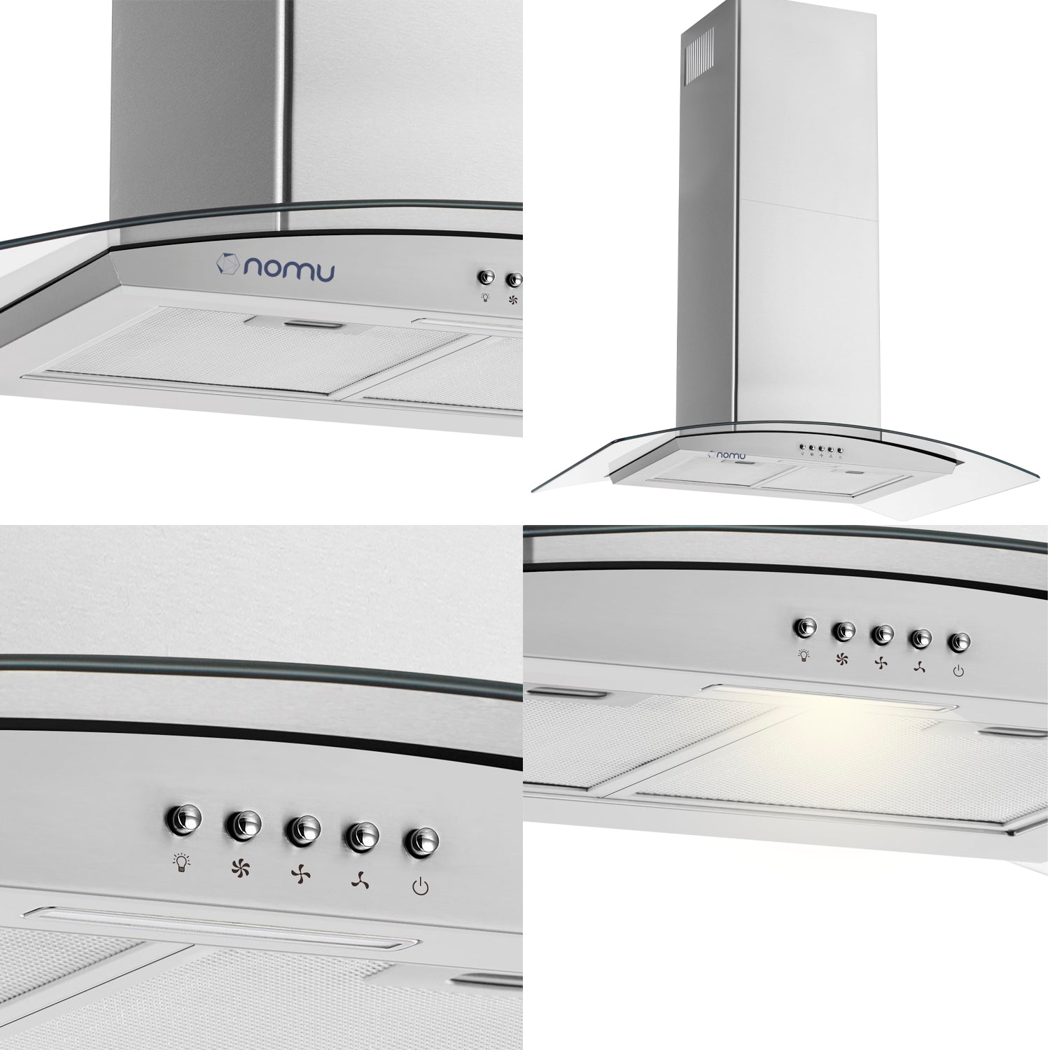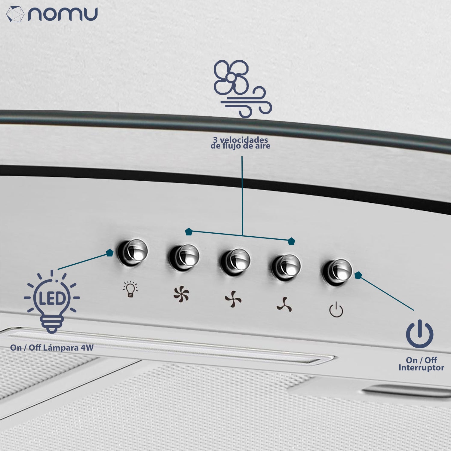 Campana extractora de pared NOMU de 60 cm, con diseño moderno en acero inoxidable y vidrio templado negro. Ideal para mantener tu cocina libre de grasa y olores, combinando estilo, eficiencia y funcionalidad.